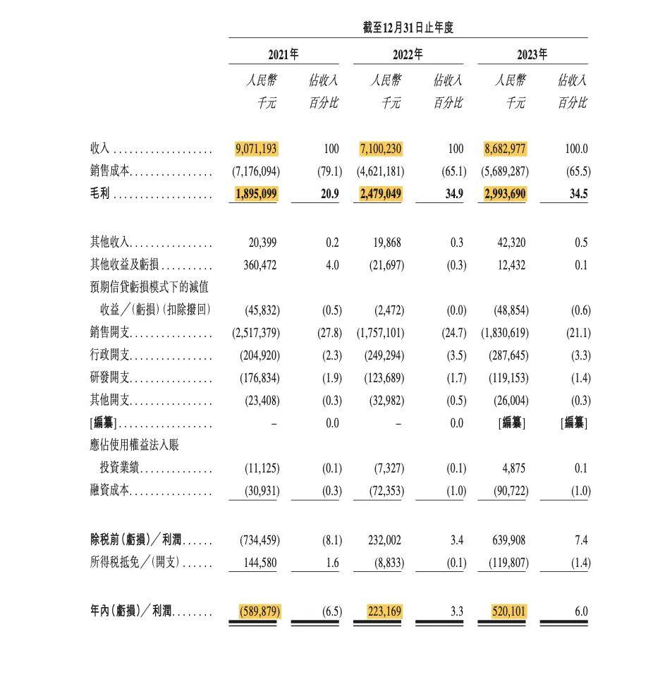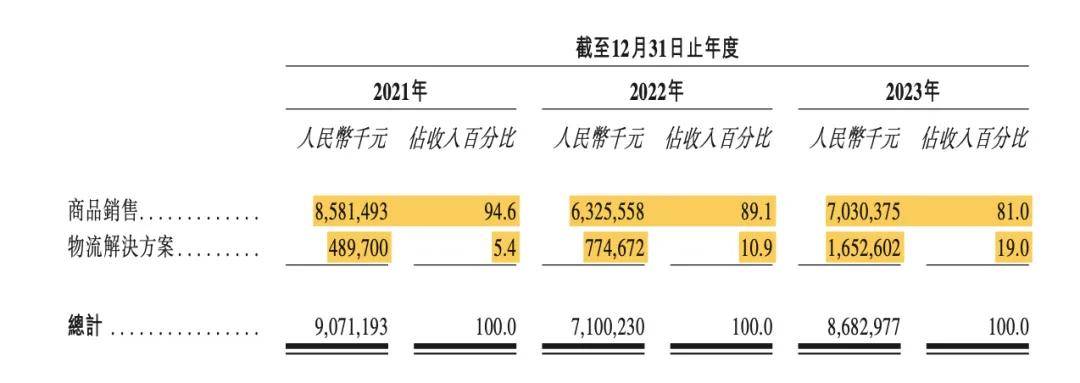 其次,除商品销售业务外,物流服务逐步成为傲基新的增长曲线。2021年~2023年,商品销售的收入分别为85.81亿元、63.26亿元和70.3亿元,分别占比94.6%、89.1%和81.0%,物流解决方案的收入分别为4.90亿元、7.75亿元和16.53亿元,分别占比5.4%、10.9%和19.0%。