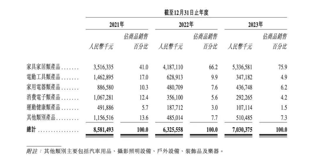 精简品类,成了傲基科技的首要选择,企业缩减了消费电子、电动工具业务,将重心重新集中于其发家品类——家具家居产品,开始走“精品+品牌”的路线。招股书显示,傲基消费电子和电动工具类产品营收占比从2021年的29.4%下降到2023年的9.1%,家具家居品类营收占比则从41%增长至75.9%,成为了公司收入的主要来源。
