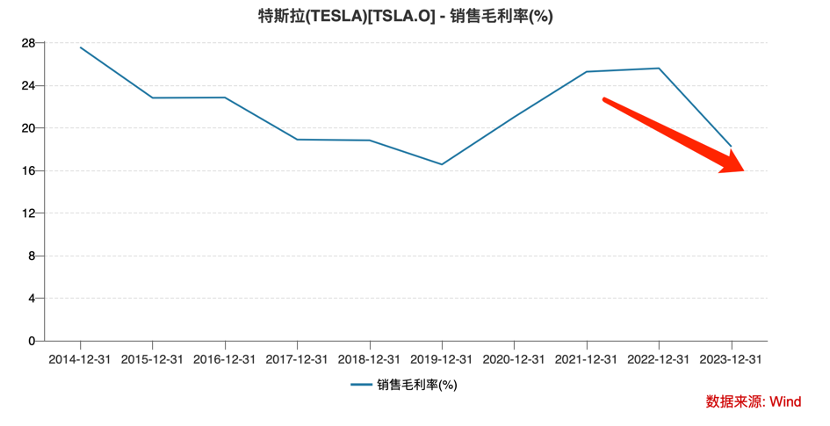 2023年特斯拉毛利率为18.25%,尚不及理想汽车的22.2%,相比苹果的毛利率可一直是在40%以上的,无论从绝对值还是参照同类企业,均说明特斯拉在新能源汽车赛道中并不具备独一无二的定价权,近期已经多次下调价格便是实例。