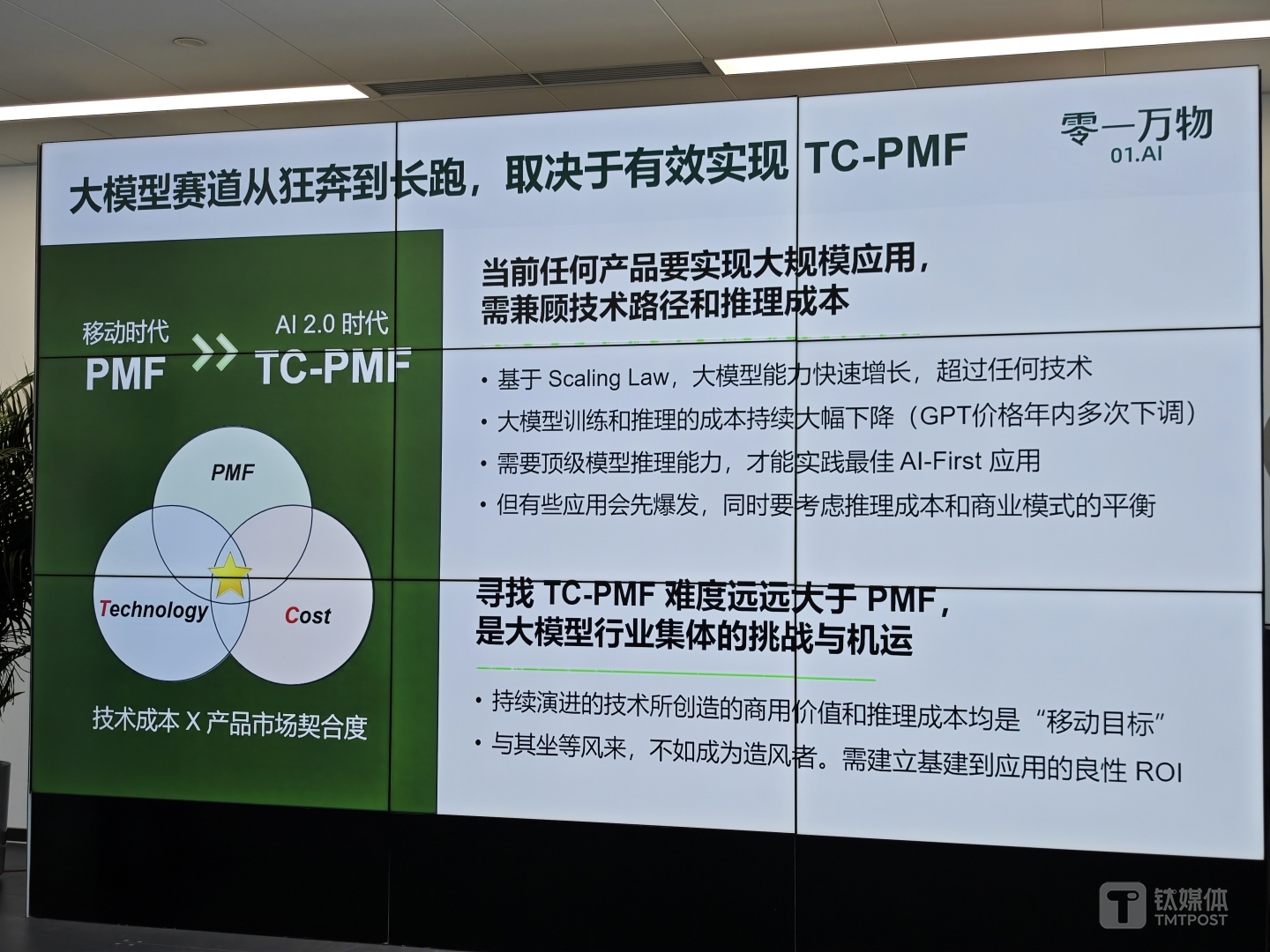 “做 Technology-Cost Product-Market-Fit(TC-PMF),技术成本 X 产品市场契合度,尤其推理成本下降是个‘移动目标’,这比传统 PMF 难上一百倍。” 李开复表示。