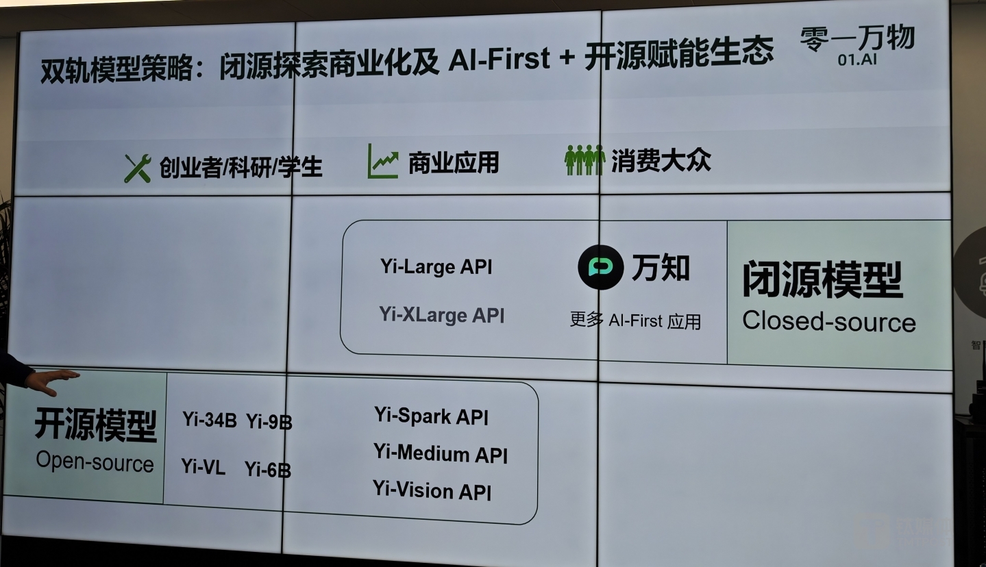 首先,李开复公布零一万物整个产品矩阵,包括开源Yi-34B、Yi-9B、Yi-VL、Yi-6B、Yi-Spark API、Yi-Medium API、Yi-Vision API六个模型组成的开源系统,闭源包括Yi-Large API、Yi-XLarge APl、2C 生产力应用 “万知”以及更多Al-First应用。