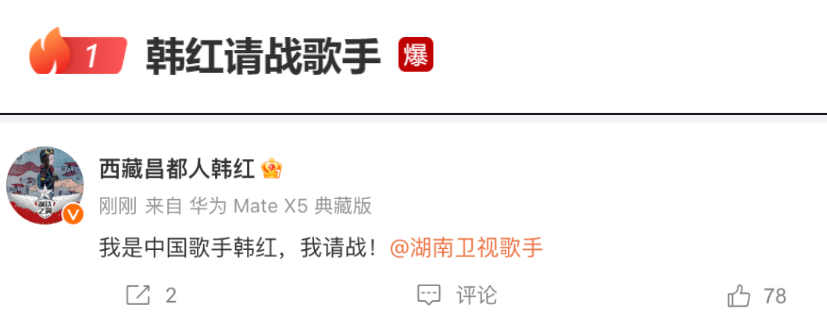 而在5月12日,歌手韩红发文“报名”湖南卫视歌手节目,并配文:我是中国歌手韩红,我请战。同时还有不少歌手也同样自荐,这些歌手中有老牌唱将,也有知名歌手。但其中也不乏有人看到了这波流量,假借“请战”名义,实则只是为了博眼球蹭流量。
