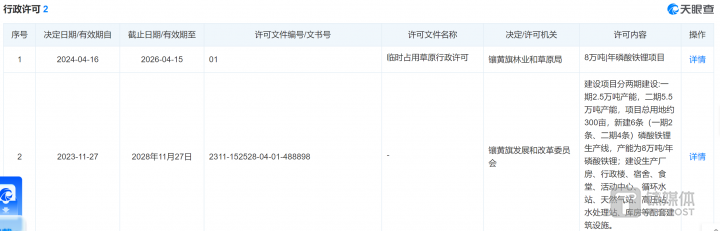 另外,内蒙安达背后拥有两项关于碳酸铁锂的经营许可项目。据天眼查显示,内蒙安达分别拥有“8万吨/年碳酸铁锂项目”和诸多碳酸锂生产线的行政许可,并且有效期较长。