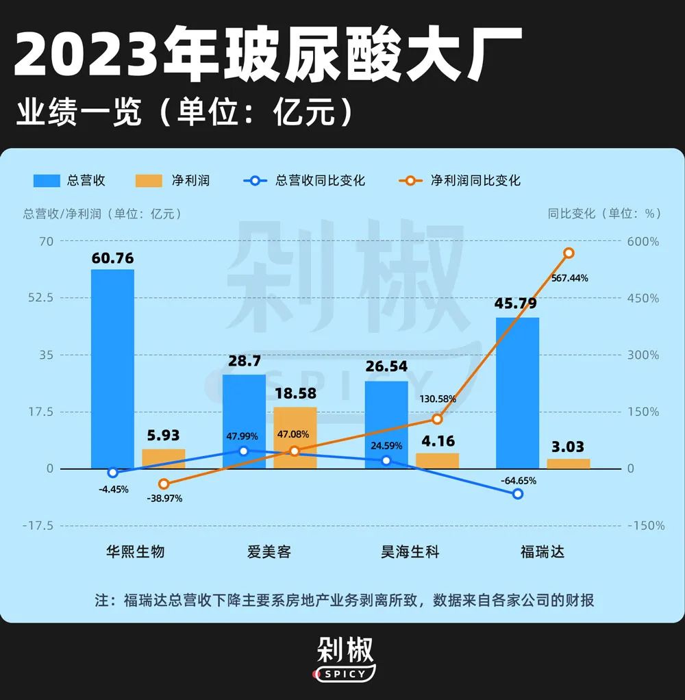 横向对比几家玻尿酸供应商大厂,答案似乎并非如此。过去一年,主营玻尿酸医美业务的爱美客和昊海生科,业绩依然保持着两位数的增长;曾经与华熙生物“同源”的福瑞达,其原料和化妆品版块也实现了两位数的增速。四所靠玻尿酸起家的上市公司中,华熙生物是唯一营收规模、净利润均同比下降的企业。