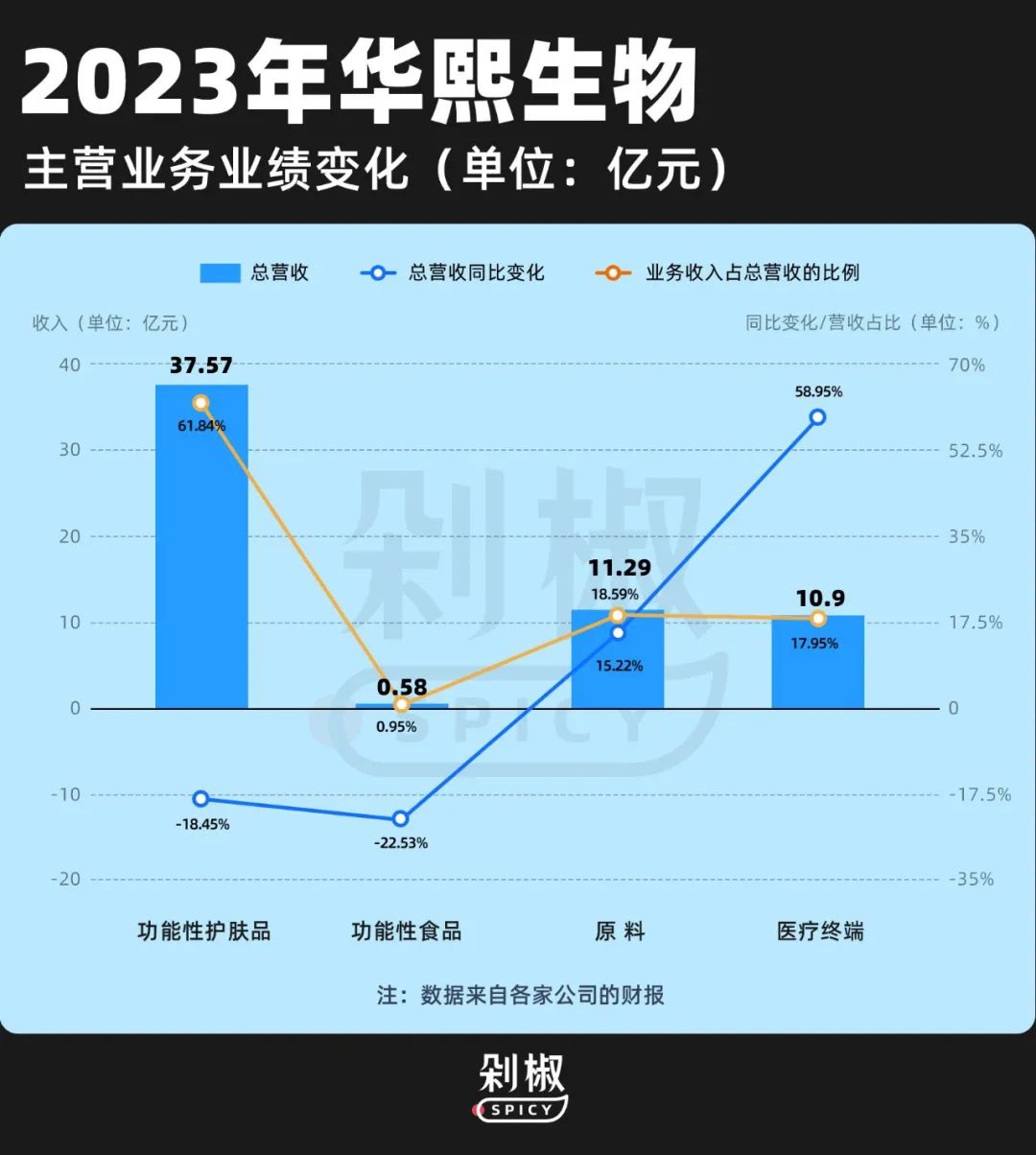 玻尿酸的“过气”,对华熙生物的影响直接体现在业绩上。过去一年,C端的护肤品收入,是华熙生物最拖后腿的业务。