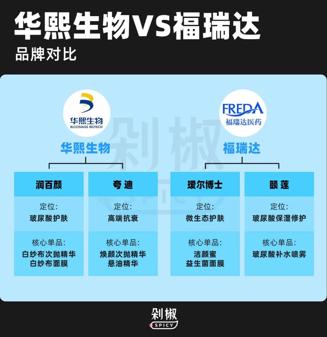 医美赛道的科研公司一般有两种发展路径,一种是面向医疗场景,做注射液、工具试剂的B端生意;另一种是直面消费者的TO C模式,利用供应链优势打造与成分相关的品牌。四家玻尿酸大厂中,“师出同源”的华熙生物和福瑞达是C端和B端两手抓。