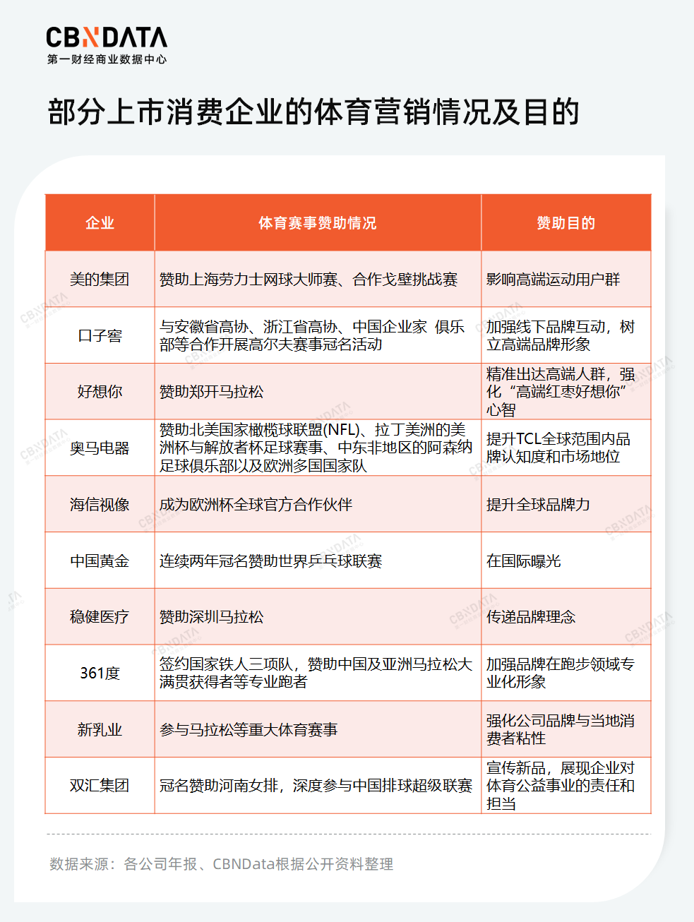 因此,2023年赛事复苏使得品牌重新聚焦体育营销,并且表现出支持热情不减。这点在许多品牌的去年年报得到明显体现。CBNData不完全统计,2023年超2成企业在其年报中提及体育营销。与2022年相比,提及体育营销的消费企业数量实现了翻倍增长。特别是在食品饮料和美容护理行业,提及企业的数量有了显著增加。