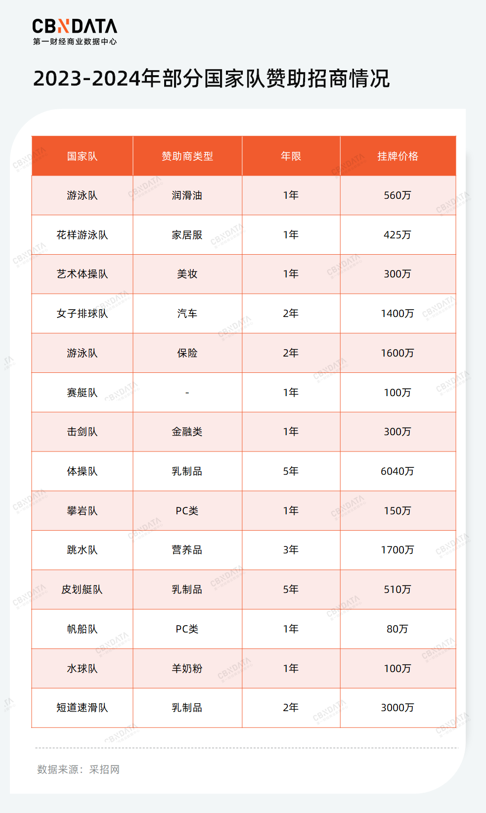 此外,相较于赛事赞助动辄千万元的高支出,签约团体与体育明星对于品牌来说相对成本更低。从近期国家队赞助商招标情况来看,除“王牌部队”体操队与“后起之秀”短道速滑队年均挂牌价格超过千万外,多数国家队的赞助费多处于500万左右,而赛艇队、帆船队、攀岩队等小众运动的国家队更是经济,年均挂牌价约在百万左右。