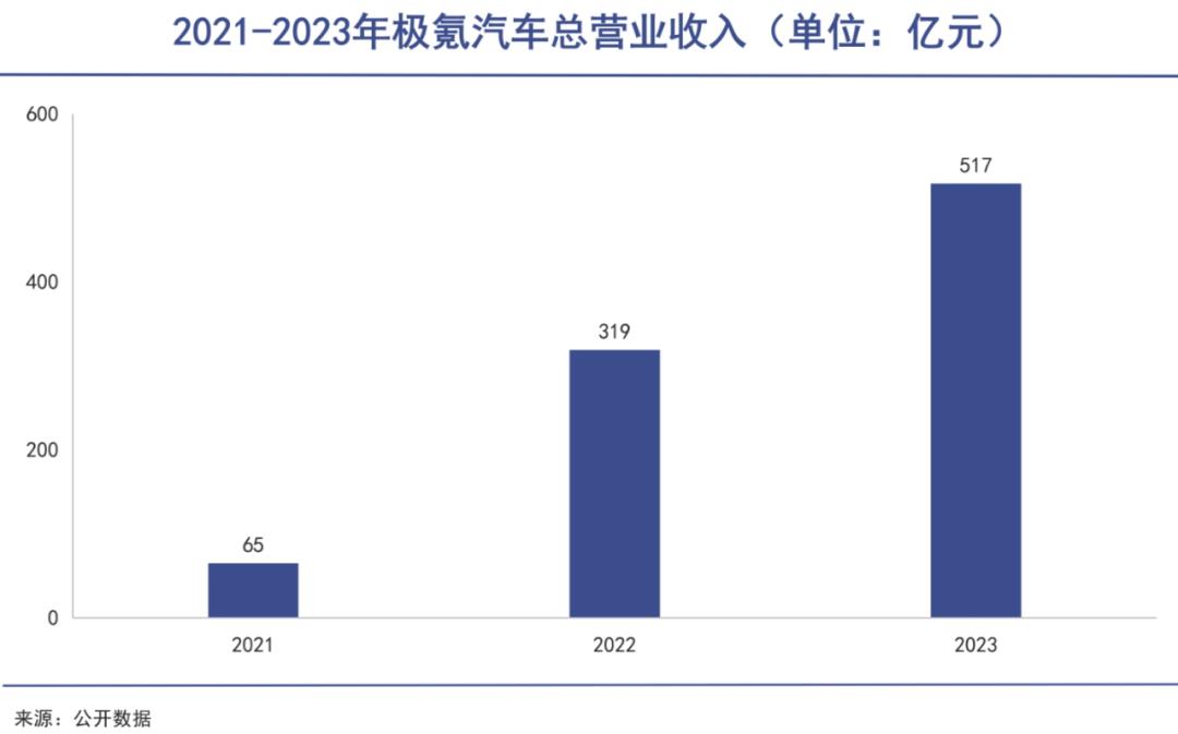 吉利的精心“投喂”下,极氪汽车表现不负众望。据招股书披露,2021年、2022年、2023年极氪总营业收入分别为65亿元、319亿元、517亿元,2023年营收同比增长62%。