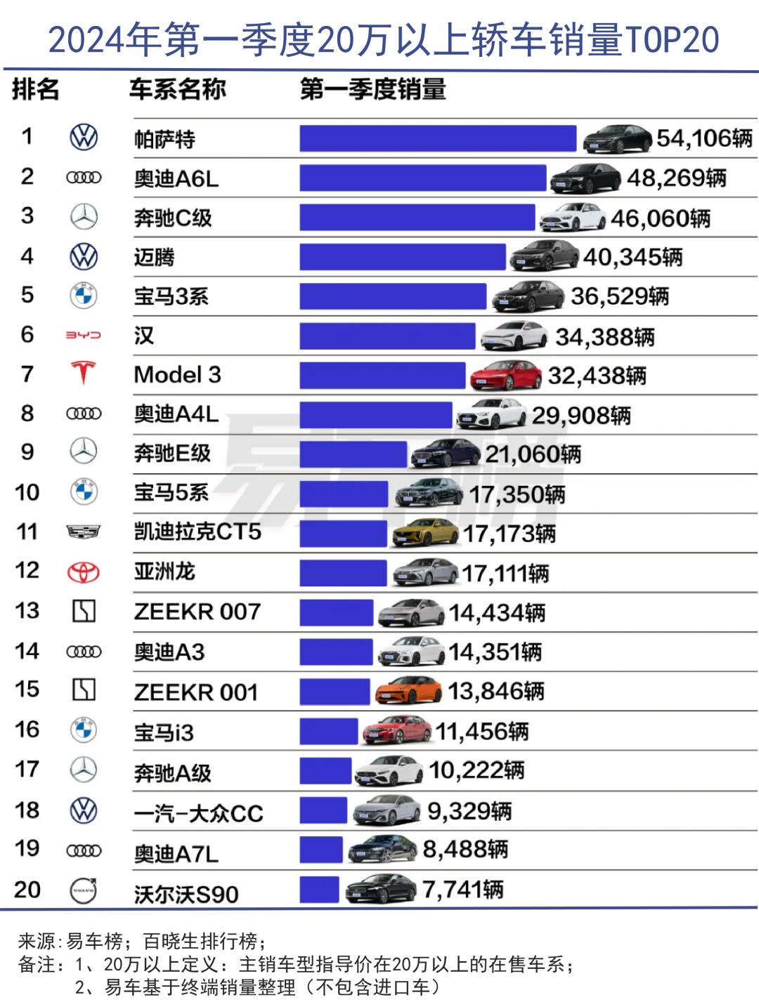 而极氪主攻的这一领域,可渗透空间仍然广阔。比如在2024年第一季度20W+轿车的销量排行榜中,20万以上的轿车几乎全都是燃油车的天下。