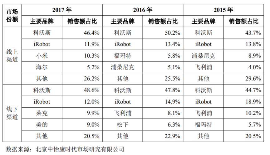 比如,根据中怡康测算,2017年我国机器人吸尘器的线上/线下零售额分别为50亿元和6亿元。