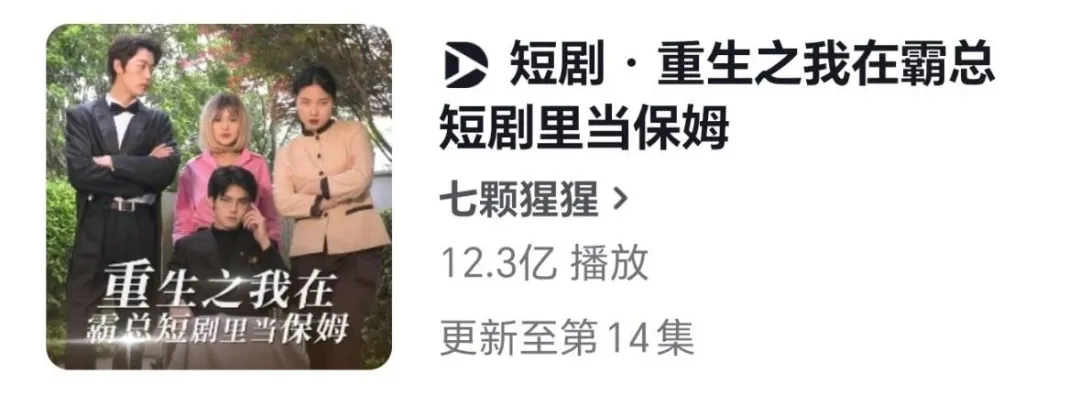 博主“七颗猩猩”创作的两个“我在xx当xx”系列短剧,上线两个月以来,系列1《重生之我在霸总短剧里当保姆》播放量高达12.3亿。系列2 是作为系列1的衍生,《重生之我在短剧里当主角》3月7号上线,更新12集,播放量达7.8亿。两个系列播放量总和达20亿!