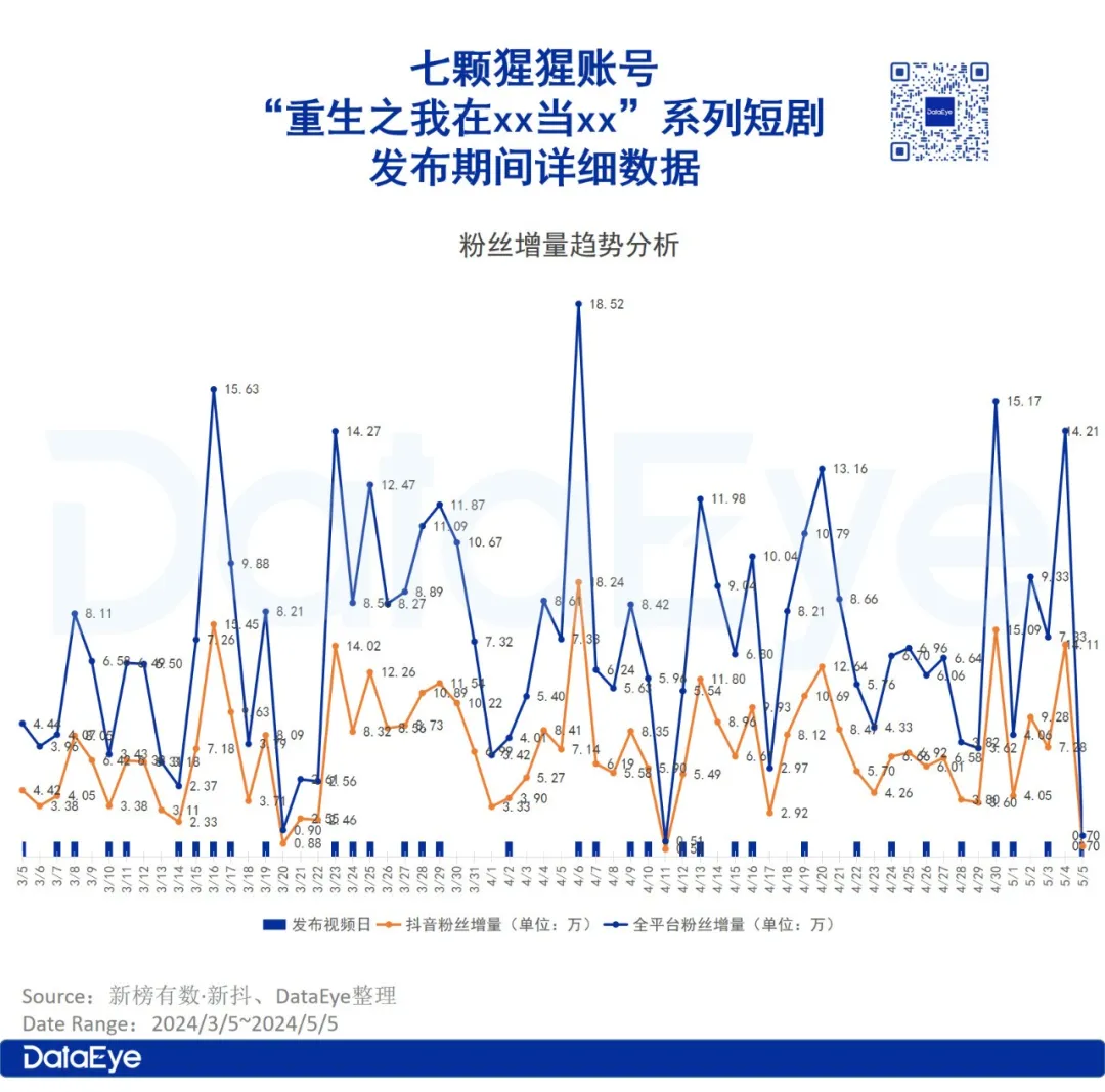 DataEye短剧观察在新抖数据平台发现,自3月5日该团队发布《重生之我在霸总短剧里当保姆》系列短剧以来,两个月涨粉449.07W,粉丝涨幅29.38%。