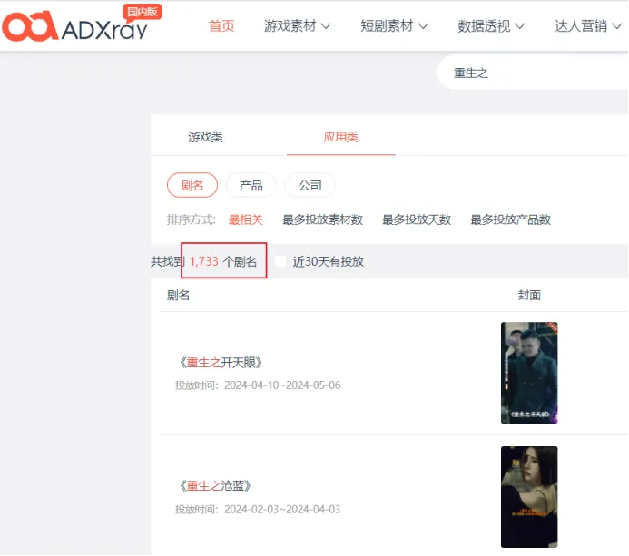 同时,在DataEye-ADX后台,以“重生之xx”为短剧名进行检索,共找到1733部剧名相关的小程序短剧。