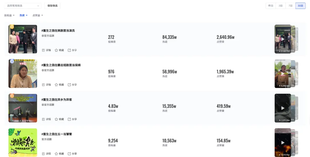 DataEye短剧观察通过在抖音广告创意平台搜索发现,以“重生之我在xx当xx”作为搜索发现,共有11个相关话题,热度最高的话题为“重生之我在爽剧里当演员”,近30天热度高达84335W。