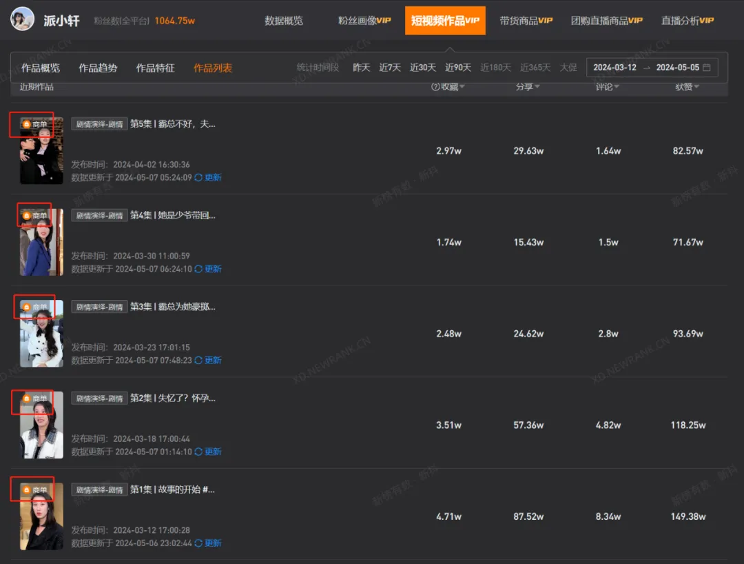 此外,DataEye短剧观察还发现,互动数最高的作品为3月5日发布的《重生之我在霸总短剧里当保姆》系列短剧第1集,达571.22W,其次是第5集和第4集。点赞数最高的是第5集,达279.63W,评论数最高的是第1集,达18W。