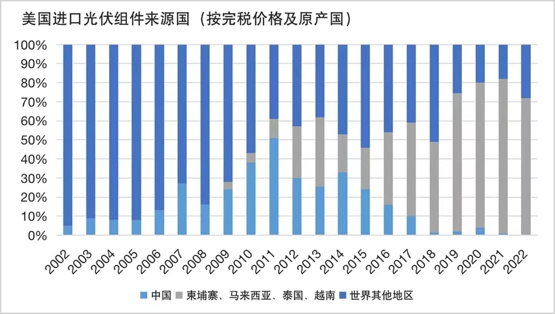 2011年“双反”之后,美国从中国进口的光伏组件占其全部光伏进口量的比重已经从最高的50%一路降至最低3%以下,但此后美国对越南、马来西亚、柬埔寨和泰国等四个国家的进口不断攀升,到2022年占比已超70%。