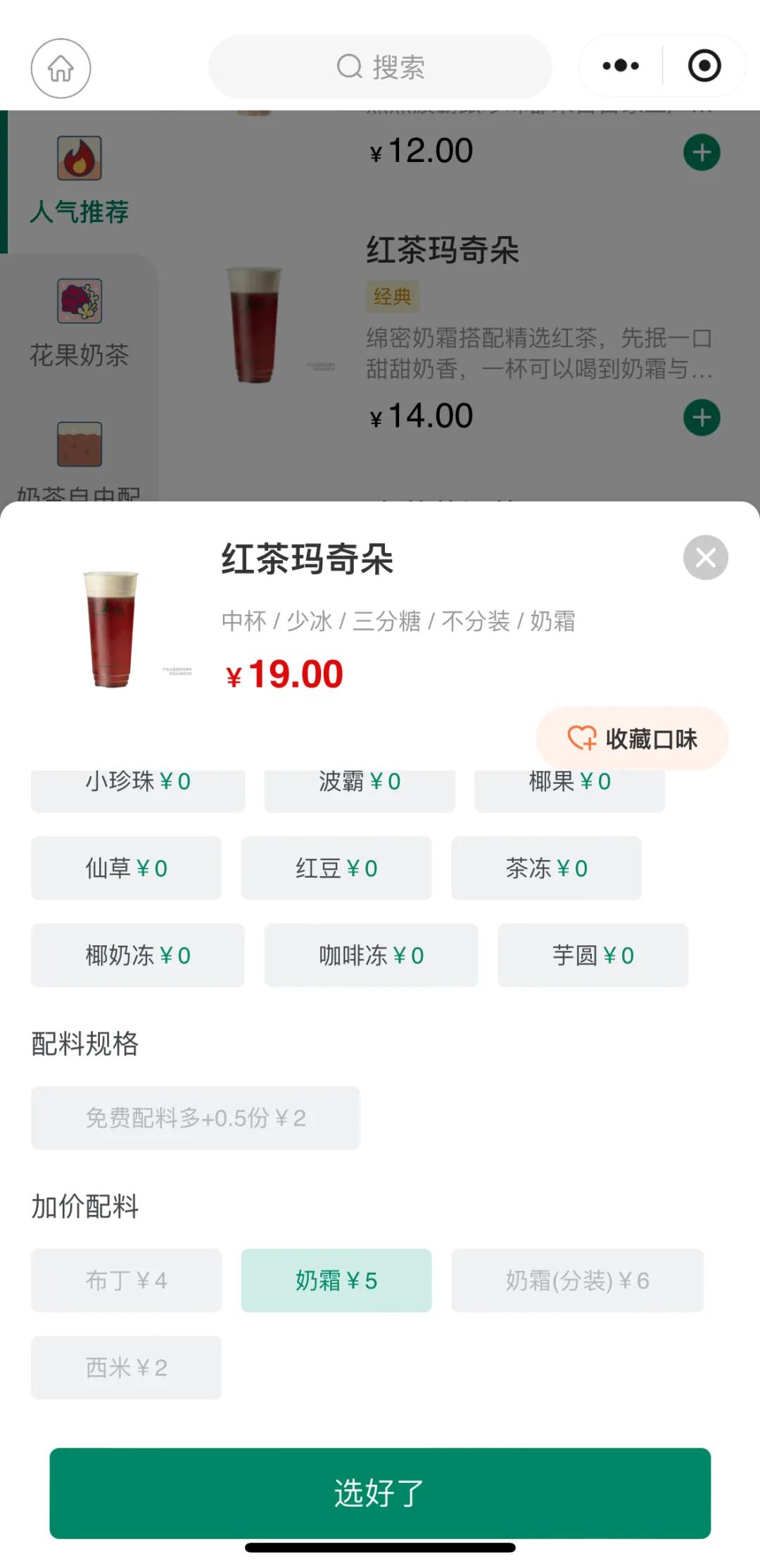 以热门产品“四季奶青”“波霸奶茶”“红茶玛奇朵”为例,定位广州地区的门店点单可以看到,四季奶青和波霸奶茶售价均从原来的11元变为了12元,红茶玛奇朵则从原本的13元上涨到了14元,在此基础上,如果再加上一份奶霜小料,一杯红茶玛奇朵的价格将会从原来的17元变成19元。