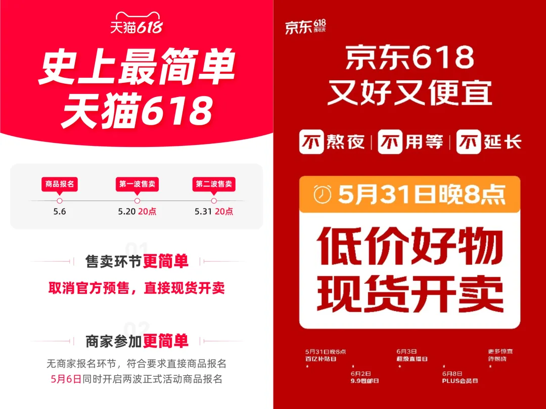 先是阿里系的淘宝、天猫在618招商中透露,将于5月20日晚8点开启第一轮促销,随后,快手电商也透露,将从5月20日起正式“现货开卖”。稍迟一些的抖音,将于5月24日开启今年的618大促。相比之下,京东仍坚持从5月31日晚8点正式开售,作为618年中大促的发起平台,京东给出的说法是:让618回归6月,不用拉长战线,在为消费者带来“又好又便宜”消费体验的同时,让购物回归简单快乐。