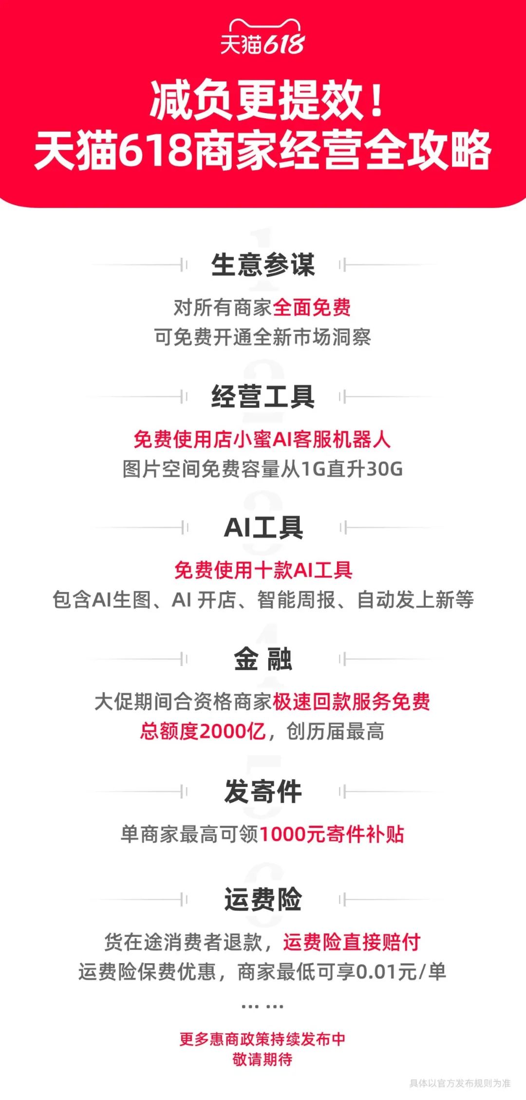 阿里系最新的动作是,今年618将向符合条件的淘宝天猫商家提供免费极速回款服务,额度高达2000亿元,这也是平台历届618活动中,最大规模的极速回款额度。借助此项扶持,商家有望0资金压力备战618。除此之外,天猫618活动期间,平台商家最低可享运费险0.01元/单、商家也可获得平台提供的利率优惠券、额度提升、15天免息期等多项权益,由此帮助商家降低资金压力与运营成本。