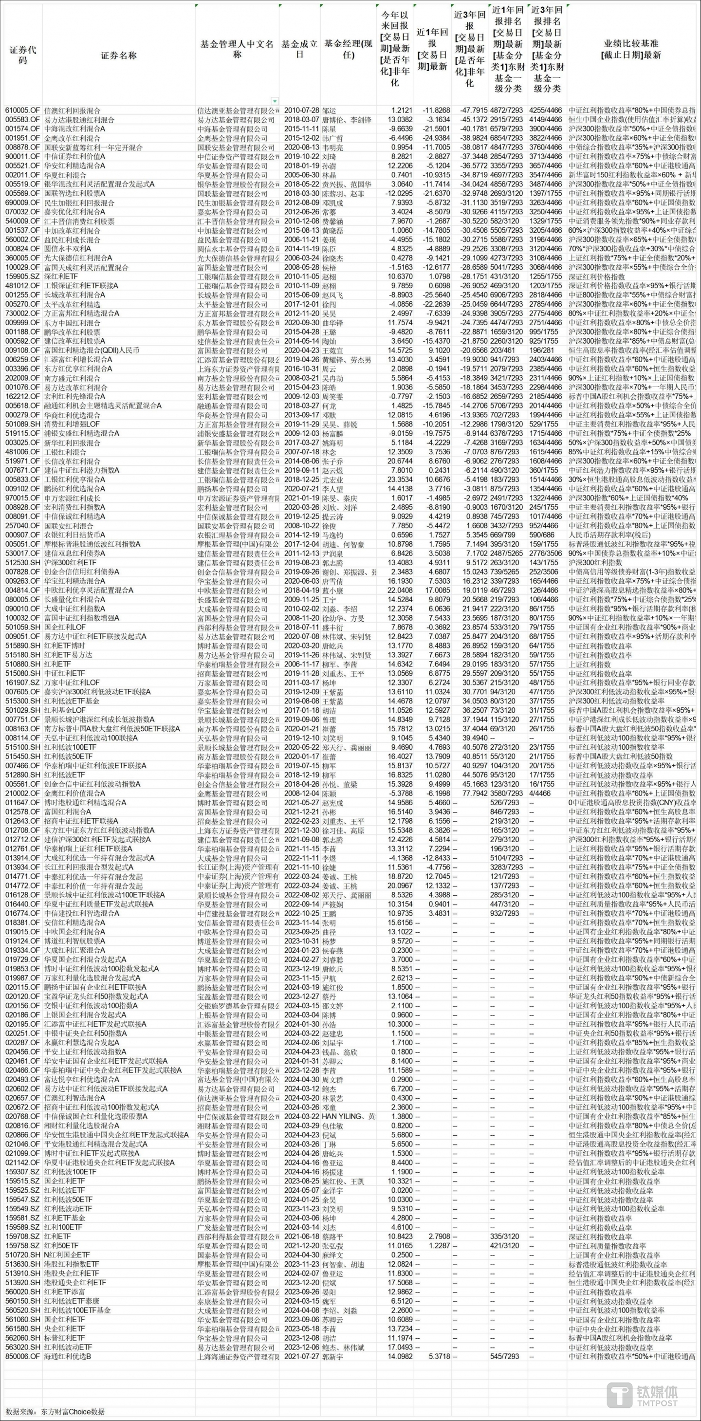 (全部136支名称中带有“红利”的公募基金主份额业绩、排名情况,可以看到,其中大部分业绩比较基准都与中证红利指数相关;数据来源:Choice终端)