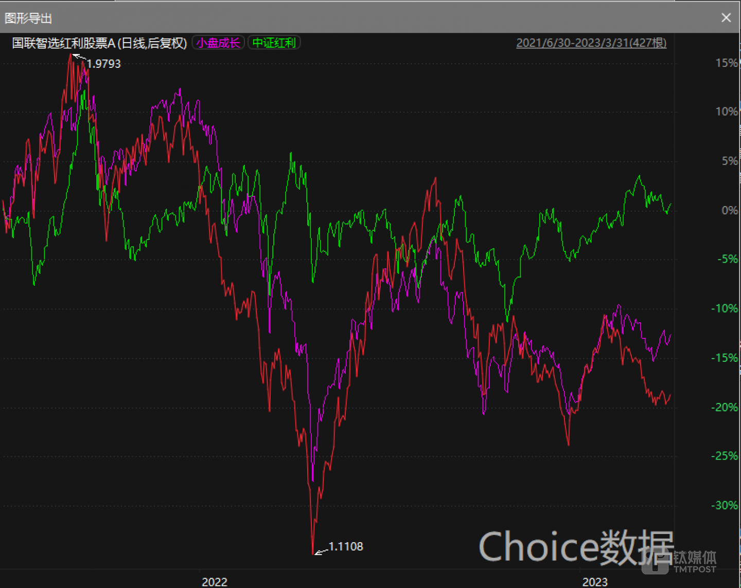 (从2021年三季度到2023年一季度,相比于业绩比较基准中证红利指数,国联智选红利股票的净值走势实际上更贴近小盘成长;数据来源:Choice终端)