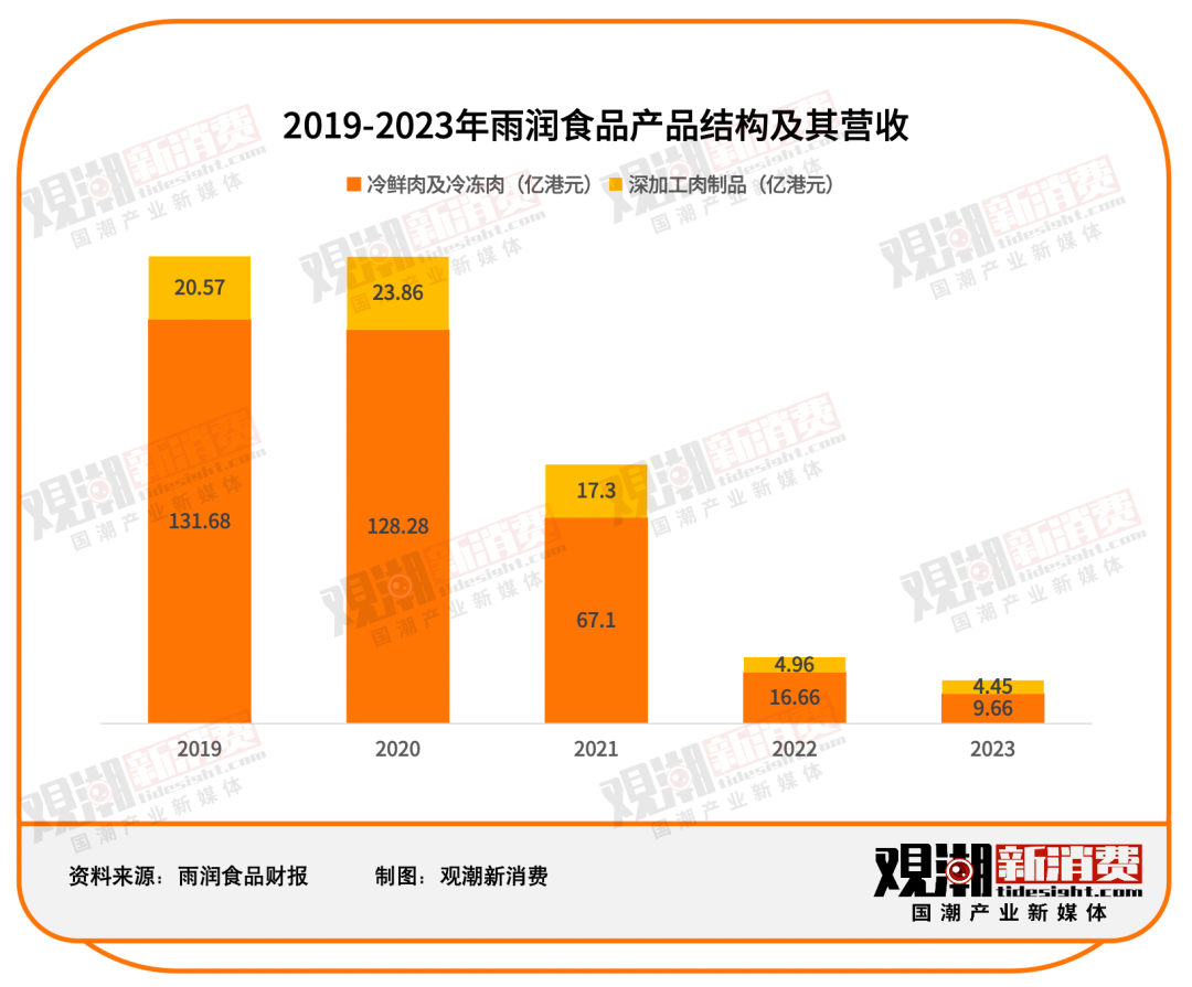 近几年来,雨润食品营收持续下滑。据其4月26日公布的年度业绩公告显示,2023年,雨润食品总营收为14.11亿港元(折合人民币约12.42亿元),同比下滑29.10%。对比之下,双汇发展2023年营收稳定在600亿元,是雨润食品的约60倍。