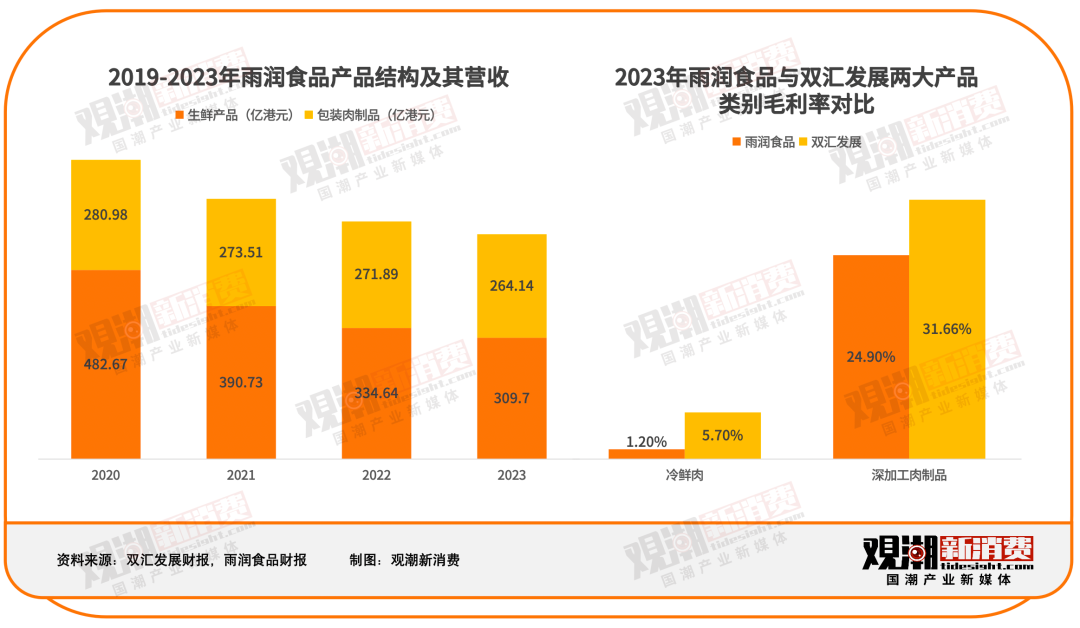 对比双汇的毛利率,雨润仍有进步空间。2023年,双汇发展的包装肉制品毛利率为31.66%,生鲜产品为5.7%,均高于雨润。
