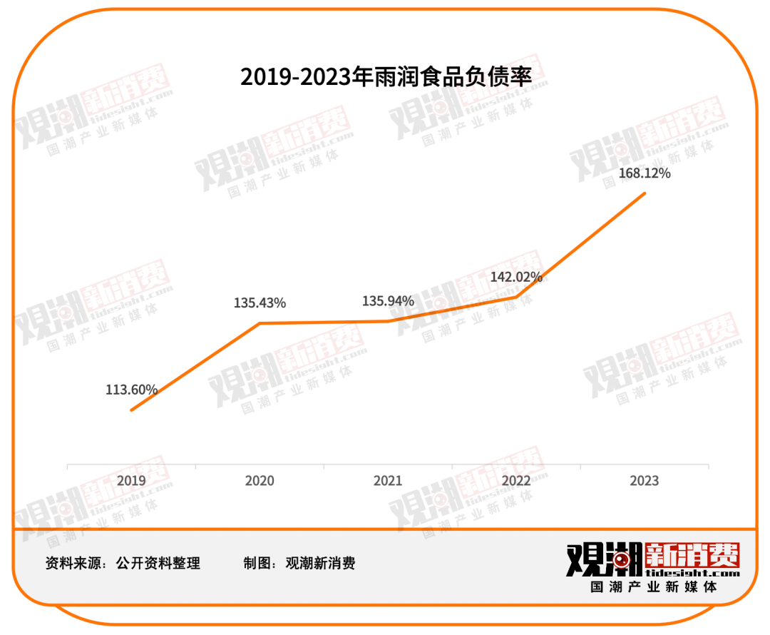 随着雨润的持续亏损,其负债率也高居不下。公开数据显示,2015年以来,雨润食品资产负债率逐年增大,2019年的资产负债率首次突破100%,为113.60%;2023年的资产负债率高达168.12%。