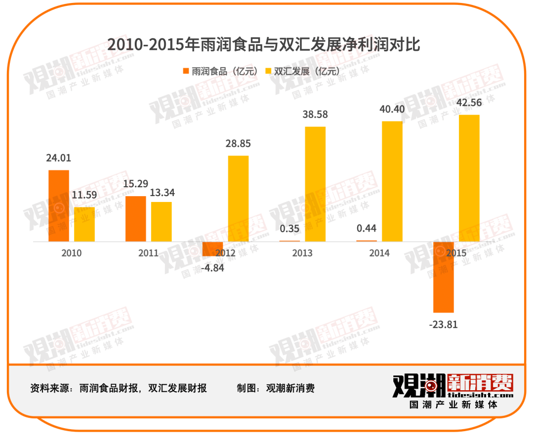 2010至2014年这五年间,双汇的净利润从11.59亿元增长至42.56亿元,而雨润食品业绩不断下滑,直至2014年颓势稍止,略有起色。