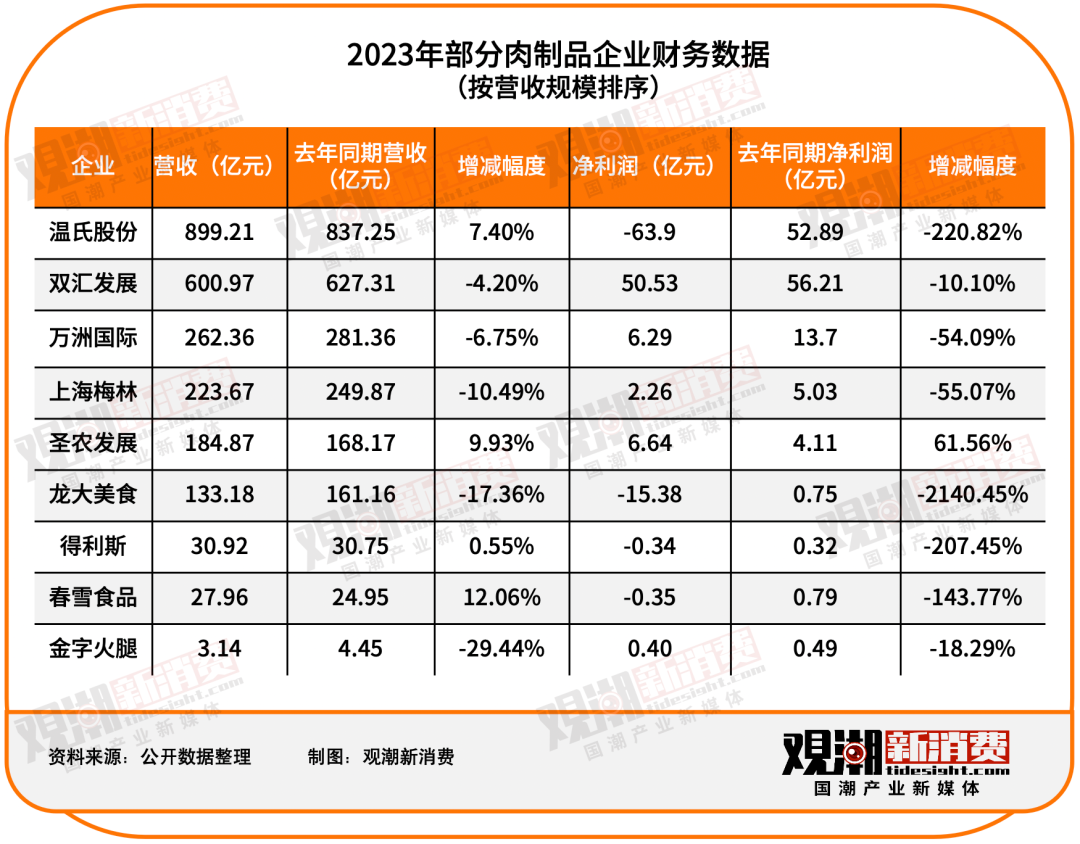 据观潮研究院统计的9家肉制品上市公司2023年业绩数据显示,除圣农发展业绩有所上升以外,温氏股份、万洲国际、龙大美食、得利斯、春雪食品等企业业绩均有所下滑。