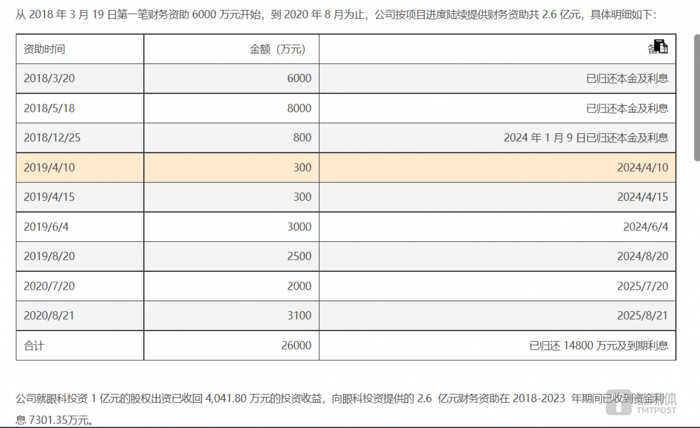 后续公告显示,从2018年3月19日第一笔财务资助6000万元开始,到2020年8月为止,通策医疗按项目进度陆续提供财务资助共2.6亿元,具体明细如下图。