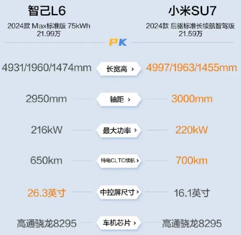 从整体账面实力来看,智己L6和小米 SU7确实大差不差。但问题是小米自带流量,智己总得做出明显的差异化才够看。