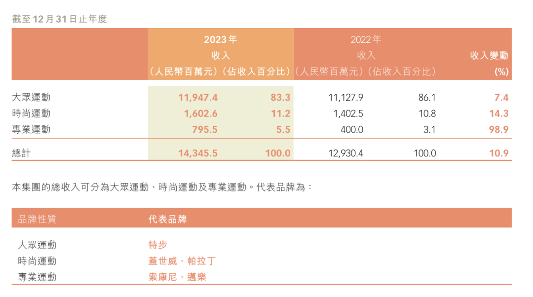 特步的收入大头来自大众运动,也就是特步主品牌,2023年该部分收入占总收入的83.3%。另外两条业务线,时尚运动(盖世威、帕拉丁)和专业运动(索康尼、迈乐)占比都很小,分别为11.2%和5.5%。不过从成长性来看,目前规模占优的时尚运动远不及专业运动,2023年,时尚运动收入增幅为14.3%,而专业运动收入增幅为98.9%,位列特步所有业务之首。
