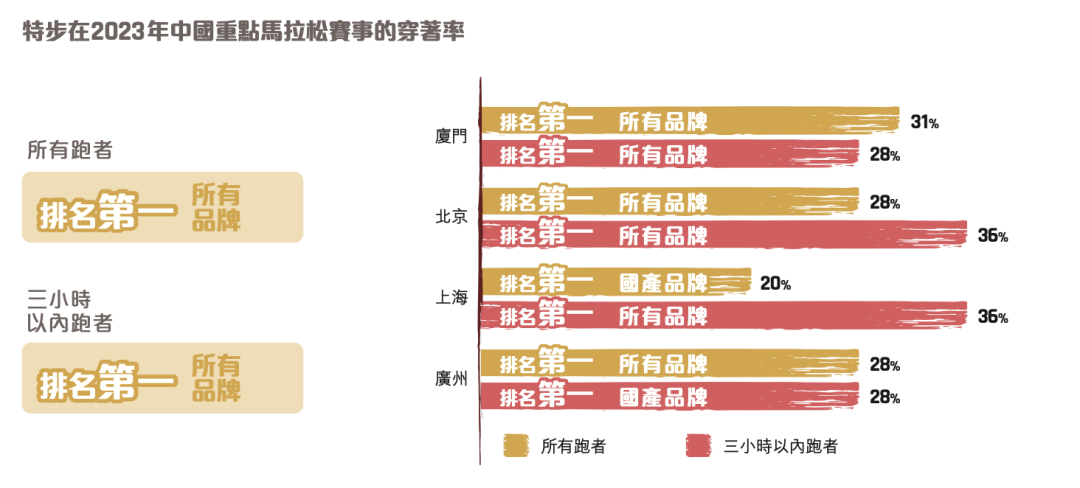 索康尼主打精英跑者,这也是特步的主战场。根据特步2023年财报,2023年特步在国内马拉松赛事中的穿着率高居参赛者以及破三者榜首,索康尼位列第三。尽管上个月的负面事件影响颇广,但特步作为跑鞋第一品牌的位置依然牢固。2023年,特步共赞助24场马拉松赛事,其中包括连续16年赞助的世界田径白金标赛事厦门马拉松。