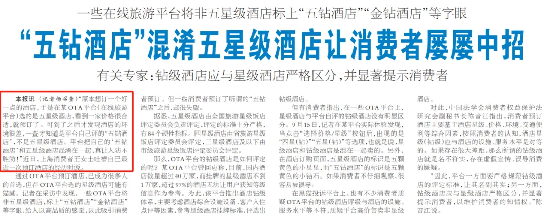 此前上海一消费者在某OTA平台(在线旅游平台)选的是五星级酒店,可到了之后才发现酒店的环境很差,一查才知道是平台自己评的“五钻酒店”。