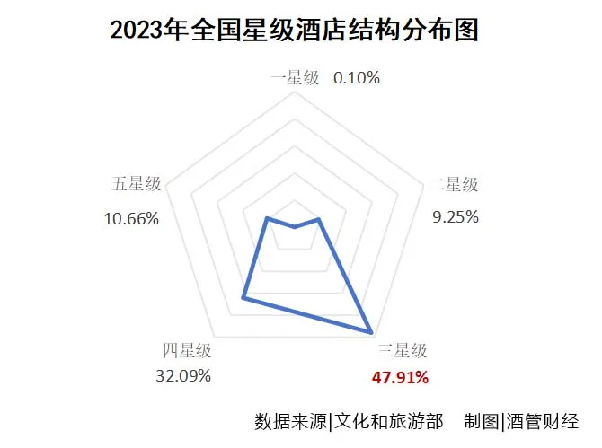 其中,三、四星级酒店占最多,合计占比80%,五星级和低星级酒店数量均逐年走低。