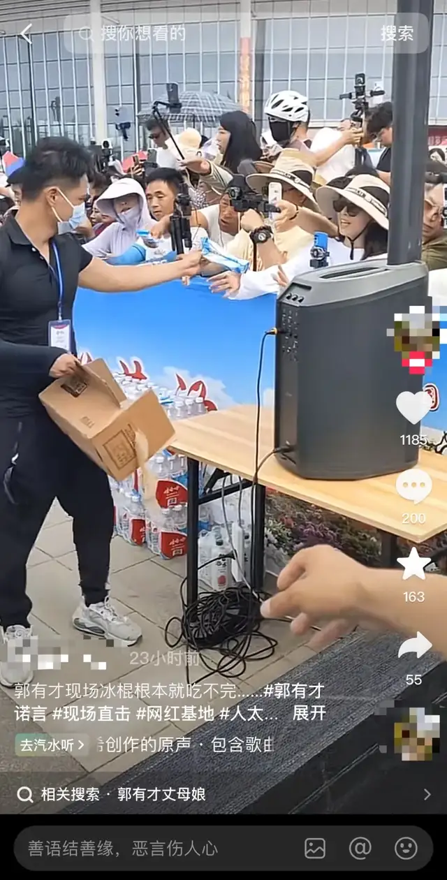 另外,通过直播也可以发现,郭有才的直播现场不仅有免费的水提供给观众,还有安保人员在维持现场直播秩序。