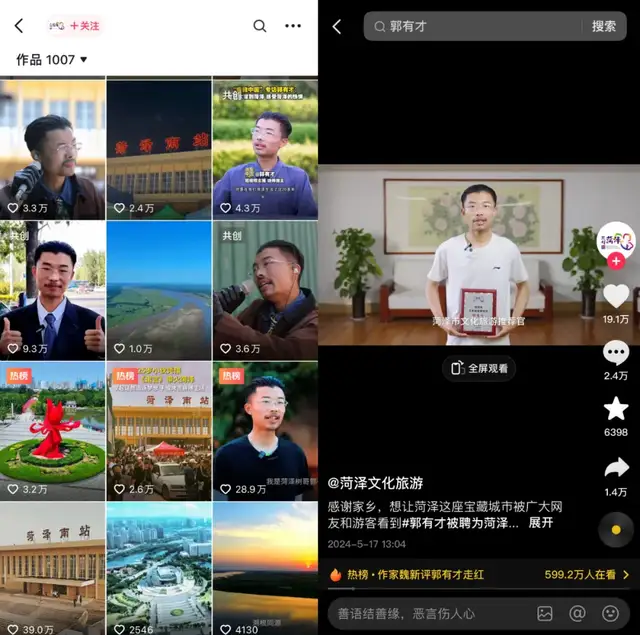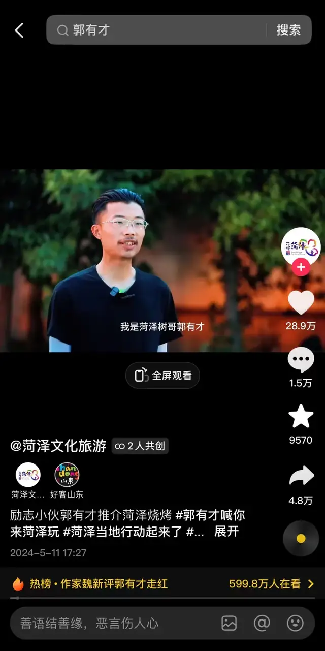 5月17日,郭有才又一次在@菏泽文化旅游中出镜,并表示自己“已被聘为菏泽市文化旅游推荐官”。
