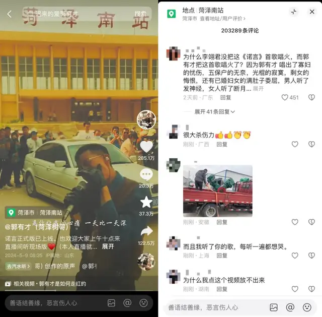 直到今年,郭有才以一身复古妆造、以及身后的一辆年代久远的摩托车,出现在早已停运的菏泽南站,才逐渐开始吸引网友的关注。一首情绪饱满、怀旧风拉满的《诺言》,火遍全网,成为郭有才出圈的契机。