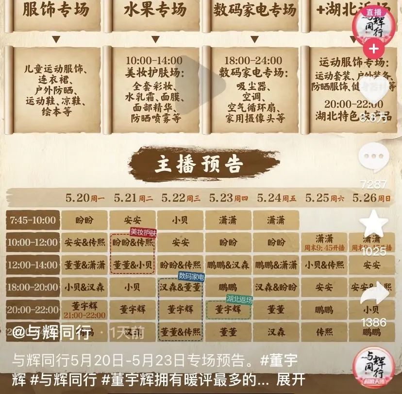 今年3月,董宇辉在谈到与辉同行的规划时也表示,要用1/3的时间做农产品带货,用1/3的时间带领大家走出去,一起领略祖国山川,剩下的时间要去做文学、电影相关的事,做名人、企业家访谈等。