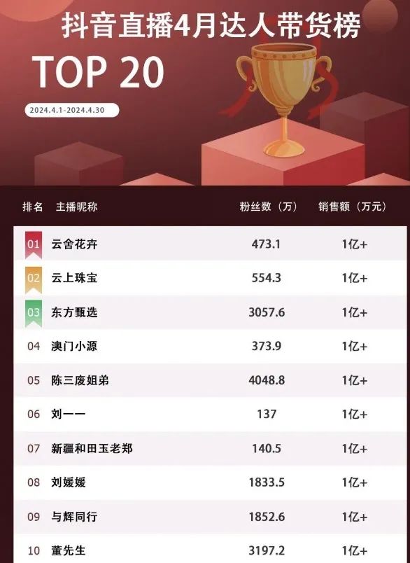 鞭牛士整合三眼查数据发布的抖音4月带货榜单显示,继2月和3月跌出榜单前二十后,疯狂小杨哥再次无缘上榜前二十。而董宇辉也在连续三个月闯入抖音带货榜前三后,排名掉到了第九名。
