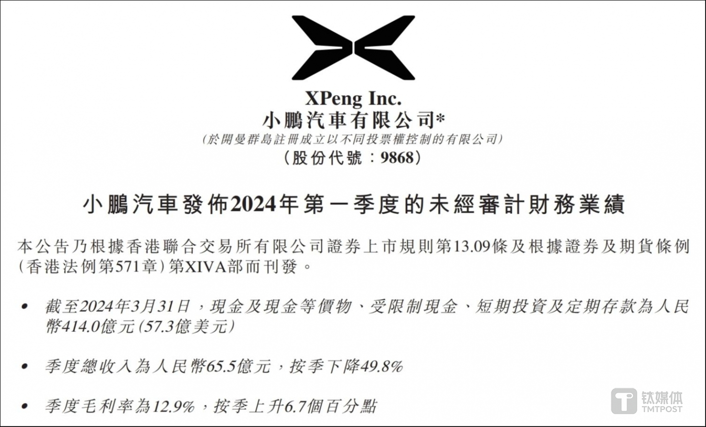 基于公司在一季度的业绩表现,小鹏汽车-W董事长及首席执行官何小鹏表示,一季度公司毛利率大幅上升到12.9%,标志着小鹏汽车-W实现了在智能电动车业务基础上,通过智能化技术输出提升盈利和国际化潜力的独特模式。