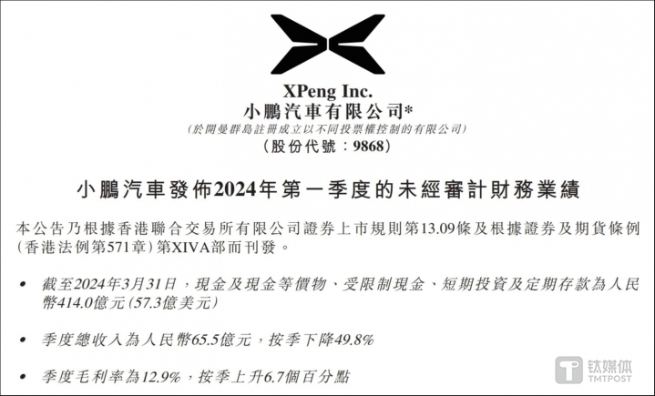 5月21日晚,小鹏汽车-W(09868.HK)发布了2024年第一季度业绩报告。期内,公司实现度总收入约65.5亿元,同比增长62.3%,环比下降49.8%;净亏损为13.7亿元,去年同期为亏损23.4亿元,同比亏损大幅收窄41.5%,但环比扩大1.5%,调整后每股亏损0.75元。