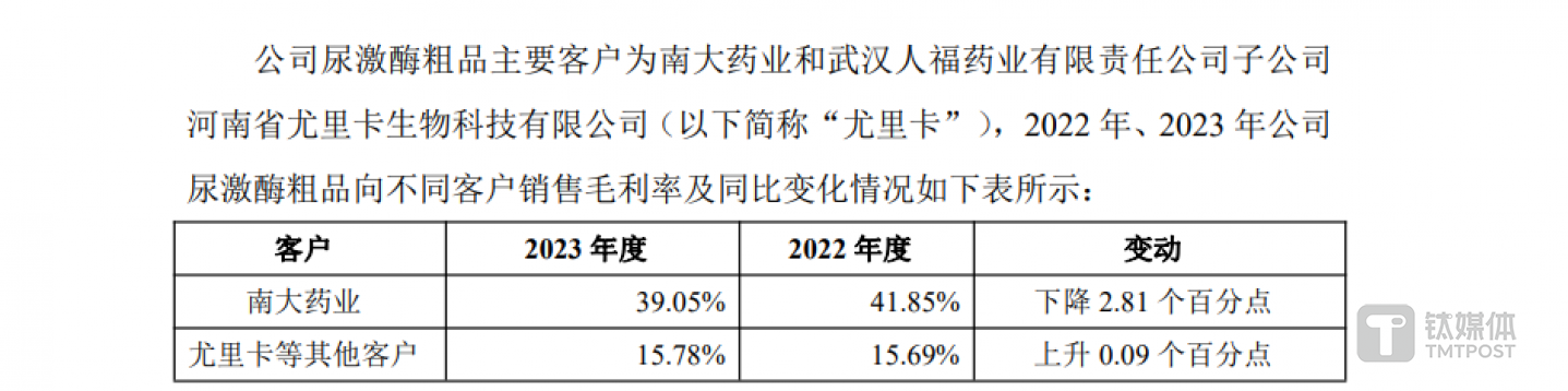 在回复中,艾迪药业表示,公司供给南大药业和尤里卡尿激酶粗品的毛利率差异原因主要系双方对尿激酶粗品生产要求不同所致。具体而言,公司前期的业务重心并未聚焦于尿激酶粗品,在满足下游客户要求的前提下,仅将采购的原料简单加工后出售、附加值相对较低,因此公司销售给尤里卡等原有客户的尿激酶粗品毛利率水平较低。