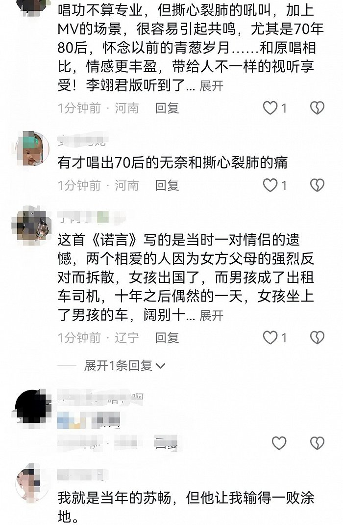 前文已经提到其专门经过设计的复古造型、环境背景、歌曲,除了《诺言》之外,他此前翻唱的《爱江山更爱美人》和《大不了,再原谅一次》也是同样的经典怀旧风格。虽然没有专业歌手的技巧,胜在“情感饱满”,引发粉丝集体怀旧跟风。