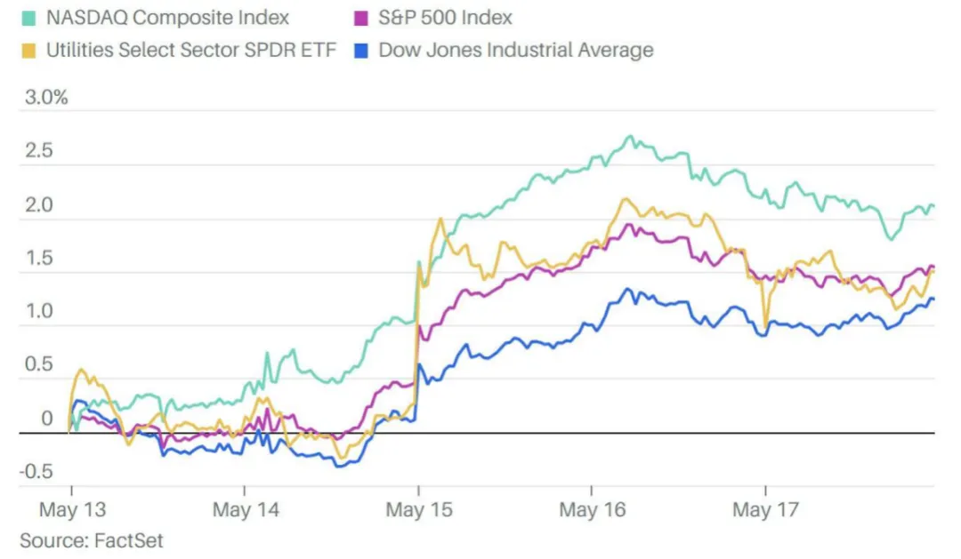 美国4月消费者价格指数(CPI)公布后,美国股市和债市上周三(5月15日)双双走高,低于预期的通胀数据进一步提振了人们对美联储将在今年年内降息两次,每次降息25个基点的信心。