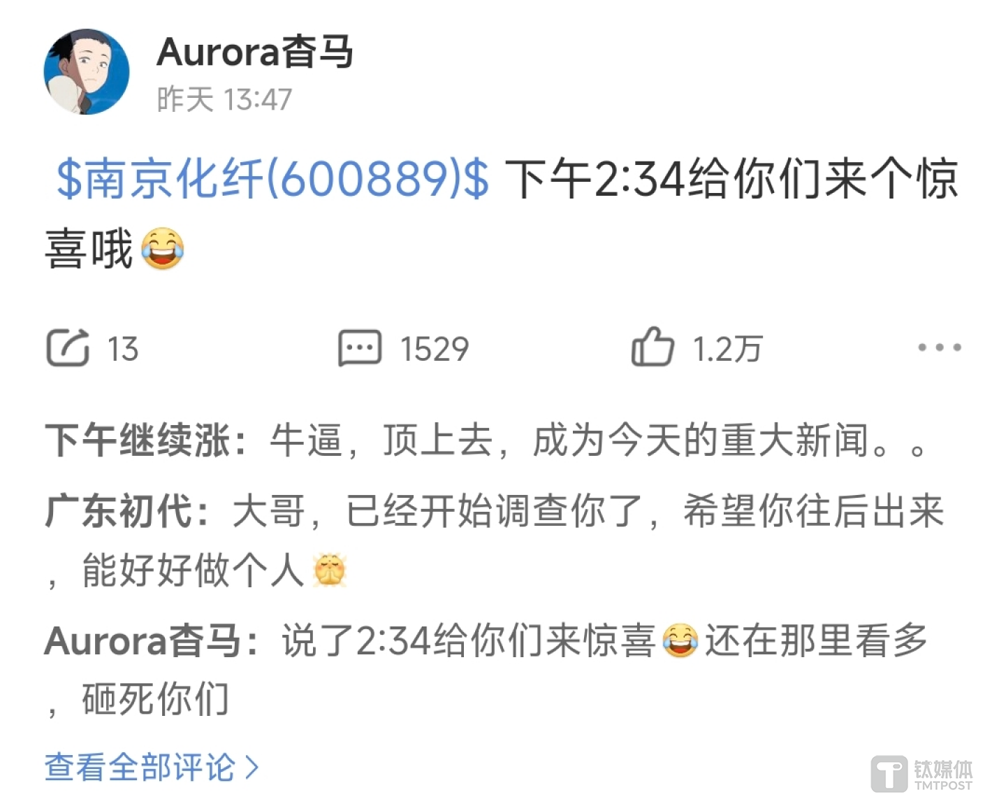 5月20日,有IP属地为山东的网友于5月20日13:47发布了一则留言,准确地预测了当日南京化纤的暴跌。