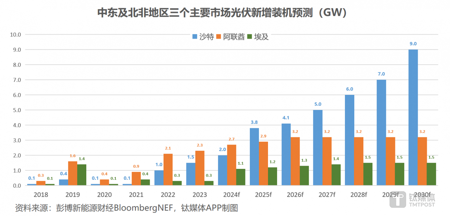 此次在市场引发关注的NEOM相关信息,实际上并无太多增量,但其中的逻辑,也就是沙特等中东北非国家加速建设新能源项目将利好中国光伏企业,在业内就得到了颇多认同。钛媒体APP在今年发布的《光伏出海“进化论”》报告中提及,整个中东北非地区截至2023年底的光伏累计装机在27GW左右,预计2024年新增光伏装机12GW,预期增速超50%,到2025年,新增装机可能进一步提升到接近14GW的水平,市场发展前景可观。而且,该地区有得天独厚的光照资源,年均太阳辐射量普遍在2000千瓦时/平方米以上,沙特、阿联酋、埃及等国也制定了新能源发展目标并出台了一系列支持政策,比如,沙特此前就公布计划,到2030年光伏装机增加至58GW,而如果这一目标实现,该国可能成为全球前5的光伏大市场。也因此,这片区域成为了我国光伏企业出海的“心头好”,龙头企业隆基绿能、晶科能源等都已在中东北非地区签下了数个电站投资建设或设备供应项目,TCL中环、天合光能于2023年达成协议决定赴沙特建厂,协鑫科技(03800.HK)也在年初表示,其规划位于沙特的多晶硅项目有望于今年正式开工建设,预计颗粒硅年产能将达到12万吨,并计划在2025年左右实现投运。CPIA也曾表示,2023年以来光伏行业赴中东的考察团一波接着一波,2024年报名的更加踊跃,说明该区域对中国企业出海的吸引力不断增加。