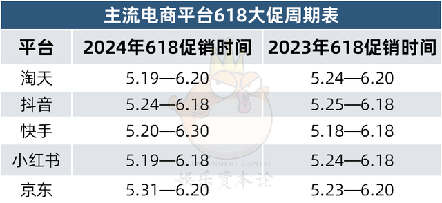 娱乐资本论统计发现,小红书、天猫、快手等平台都不约而同地拉长了今年618大促的时间。其中,快手的大促足足维持42天之久,成为史上最长的618大促周期。对比之下,京东却一反常态,不仅开售时间晚,时间也更短,只有21天。